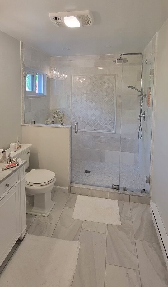 This elegant bathroom refresh features soft marble tones and a spacious glass shower for a clean, luxurious finish.