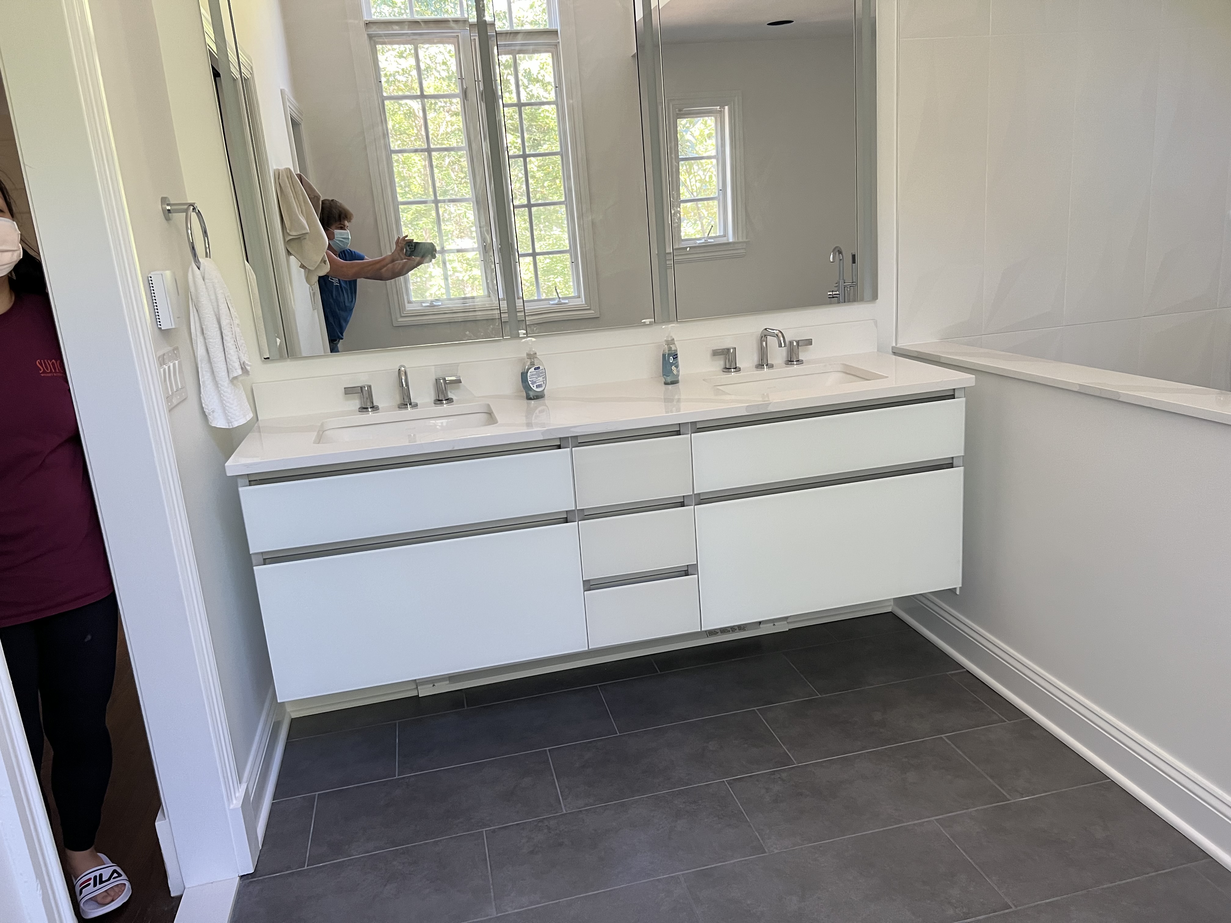 This floating double vanity delivers sleek, modern minimalism with crisp lines and effortless elegance.