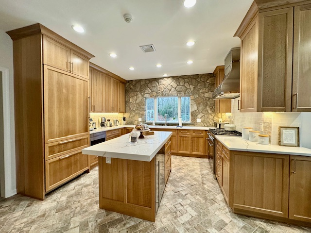 This thoughtfully designed kitchen blends warm white oak cabinetry, quartz surfaces, and a natural stone accent wall for a refined yet grounded elegance.